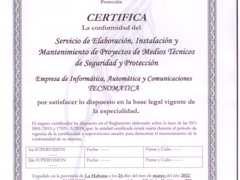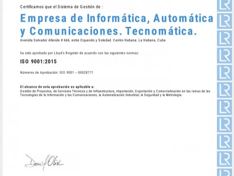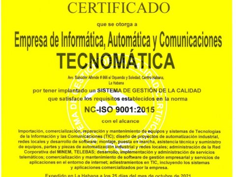 Certificado de Sistema de Gestión de la Calidad otorgado por La Oficina Nacional de Normalización a Tecnomática por tener implantado el mismo ofreciendo los