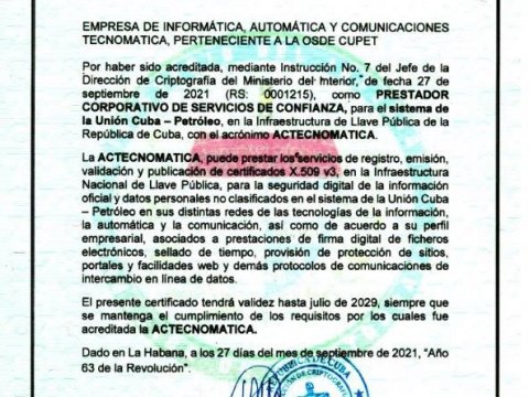 TECNOMATICA, es portadora de la certificación como Prestador de Servicios Criptográficos de Certificación.
