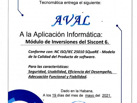 Se entregó Aval de Calidad a la aplicacion informática Módulo de Inversiones del Siscont 6 conforme a la Norma NC/IEC 25010 que otorga la Dirección Técnica.